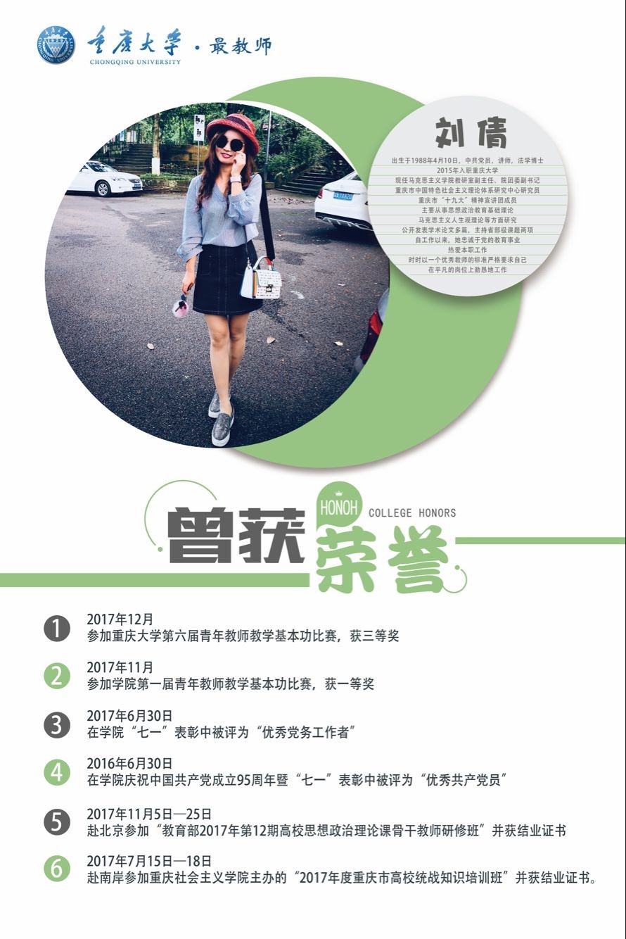 2018年6月7日下午,评选活动之公开展示环节在虎溪校区理科楼101报告厅举行,来自全校不同学院的十五位老师参加了公开展示环节。经过激烈的角逐,刘倩老师以深厚的理论底蕴以及精彩的演讲获得在座的教师评委与学生评委的青睐,最终喜获重庆大学第六届“最受学生欢迎的老师”称号。