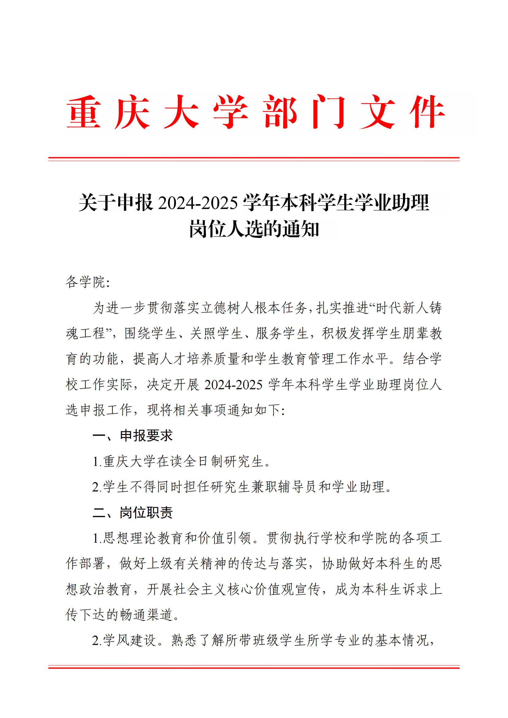 关于申报2024-2025学年本科学生学业助理岗位人选的通知