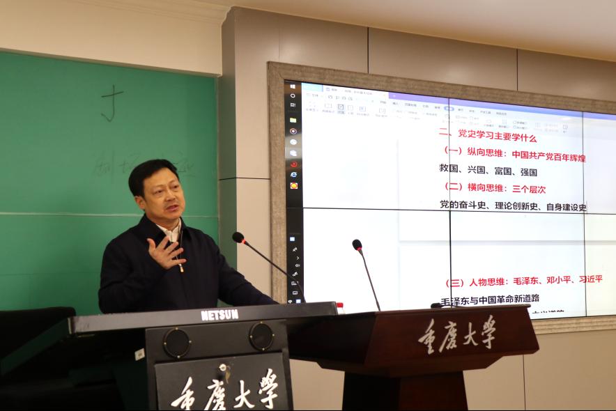 何教授采取纵向思维,分别从中国共产党“救国史”、“兴国史”、“富国史”、“强国史”四个方面展开党史学习分享。党的“救国”史方面,何教授以“为什么要建立中国共产党”、“中国出了个毛泽东”以及“打出了一个崭新的中国”为主要内容,深刻论述了建党的紧迫性、必然性和党逐渐成熟的成长道路。党的“兴国史”方面,何教授以社会主义制度的建立为主要学习线索。“富国史”则以邓小平同志与新时期为主要切入点。党的“强国史”方面,何教授着重论述了在党的领导下中国特色社会主义进入了新时代之“新”的含义。最后,何教授总结到,历史和实践证明“只有坚持和发展中国特色社会主义才能实现中华民族伟大复兴”。